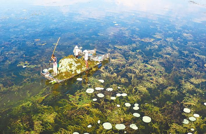 2025年8月27日,工人在洪湖水域开展常态化巡护与清理作业,以确保阳光能够充分照射到湖底,为水生植物生长创造适宜环境。