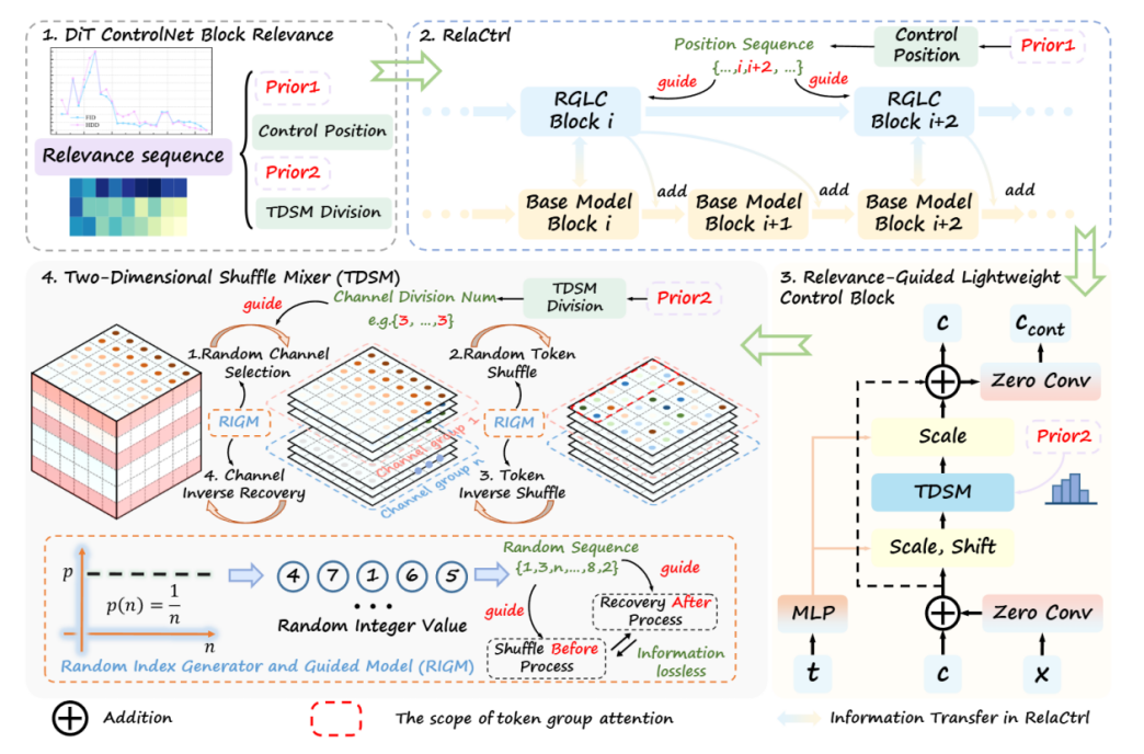 针对上述挑战,研究团队提出了相关性引导的高效可控生成框架 RelaCtrl,在不牺牲生成质量的前提下,以更加精炼、智能的方式将控制信号融入扩散变换器。该框架首先定义并计算“ControlNet相关性得分”,通过在推理阶段逐层跳过控制分支,系统评估各层控制对最终图像质量和控制精度的影响。基于这一度量,RelaCtrl 可自适应调整控制层的插入位置、参数规模与建模能力,有效削减冗余参数与重复计算,在控制能力与资源利用之间实现动态平衡。在结构设计上,团队进一步以精心设计的二维随机混合模块(TDSM)替代传统复制模块中的自注意力机制和前馈网络(FFN),构建高效的词元混合器与通道混合器,在保持表达能力的同时大幅压缩计算成本。实验结果表明,与典型 ControlNet 方法相比,RelaCtrl 仅以约 15% 的参数量和计算复杂度即可获得更优的生成表现,在多项定性与定量指标上均展现出显著优势。