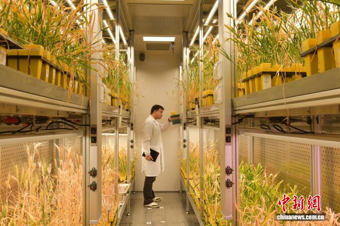 11月2日,中科合肥智能育种加速器创新研究院,工作人员正在查看育种加速器加代舱内的小麦。中新社记者 储玮玮 摄