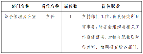 根据《中国科学院研究所中层领导人员选拔聘用和管理实施办法》(科发党字〔2017〕25号)、《中国科学院合肥物质科学研究院中层领导人员和中层管理人员选拔聘用和管理实施细则》(科合院发人教字〔2020〕10号)等相关规定,经所务会研究,决定在智能所范围内公开招聘综合管理部门负责人,具体内容如下: